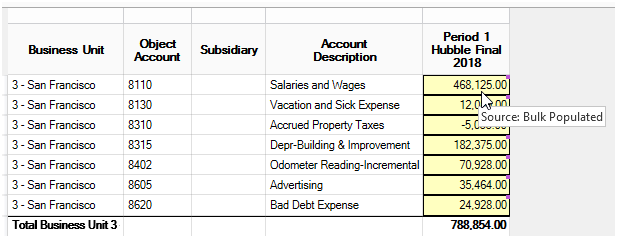 The Ledger Copy feature has a source tracking identifier so that when users can identify which numbers have been populated through Ledger Copy. By holding CTRL+SHIFT while clicking Enter Budget, users can see that these numbers are identified as ‘Bulk Populated’ and have a lavender colored dot at the top right-hand corner of the cells.