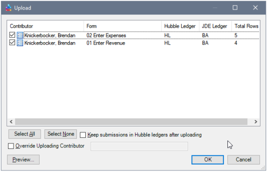 Preview displays the data that will be uploaded. In this dialog, you see every submission as a separate row and show its associated status. To do this, it joins the data table with the status table from the Budget Database. This means that each data row is displayed with a status for that row in terms of when it was submitted, finalized, and approved.