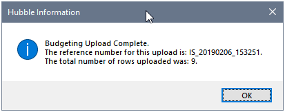- Press OK to transfer submissions from the Budget Database to the Balances Batch Table (F0902Z1) in JD Edwards. This table must exist for the budgeting upload to work.