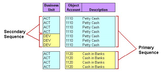 For example, if Object Account is the primary sequence and Business Unit is the secondary sequence, then the Business Unit labels will be sequenced within a particular Object Account. The following figure demonstrates this concept: