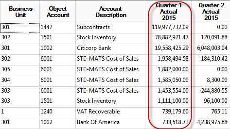 The below example illustrates a Business Unit inquiry that has been sorted based on the Asset Accounts in Quarter 1. Notice that the order of the Business Unit labels has now given way to the sort order of the Quarter 1 2010 value column.