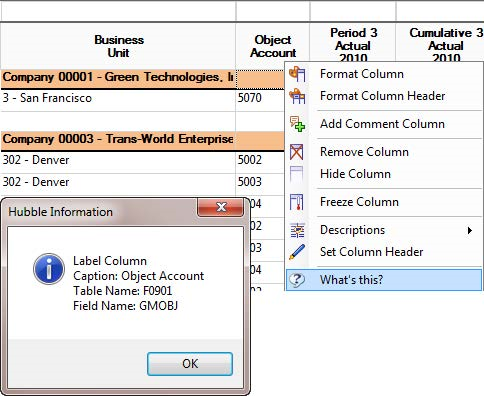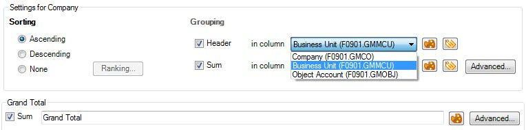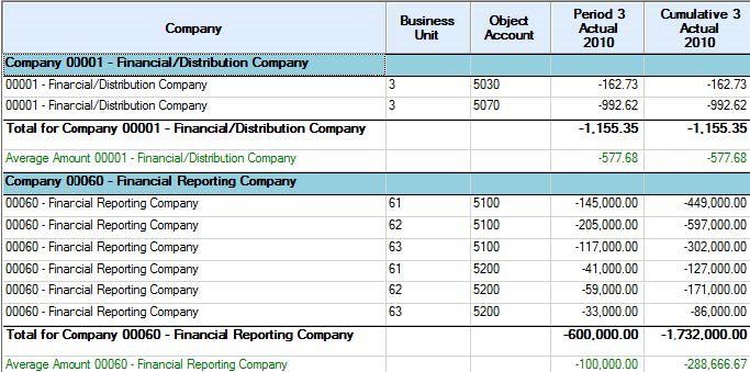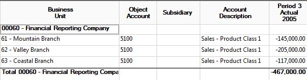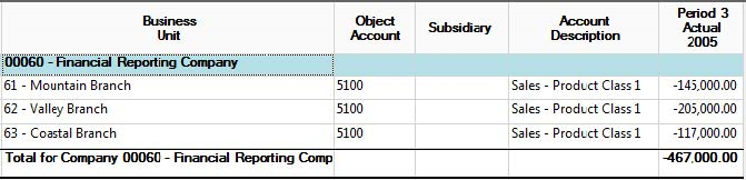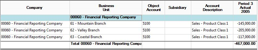 In this example, the Company column is hidden. When you run the inquiry, you see a header row and subtotal for Company 60. The Business Units that belong to Company 60 are all included in the grouping.