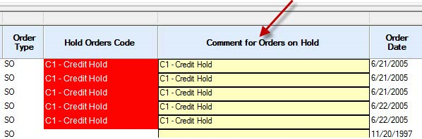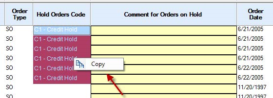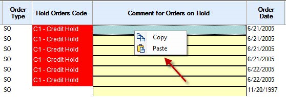 In the example below, the 'C1 - Credit Hold' text is copied from the Hold Orders Code Column to the Comment Column.