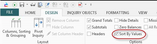 You can also quickly change between the two by going to the Design menu, in the Options group, and either turning on or off the Sort by Values Option. When turned on, the sort order includes sorting by values. When turned off, sorting is only done within label columns. In both scenarios, Hubble goes according to what has been set in Columns, Sorting & Grouping as far as which values/labels to sort by first, second, etc.