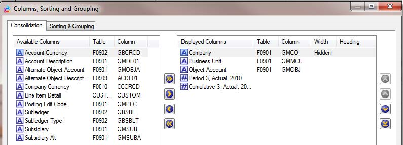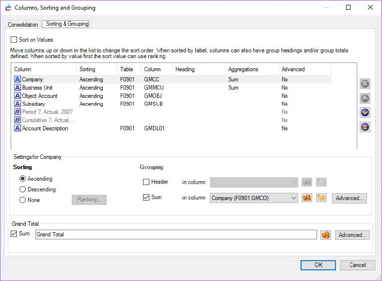 The Consolidation tab in the Columns, Sorting and Grouping dialog displays the columns currently in the inquiry on the right-hand side of the window. Label columns are indicated with an icon and value columns with an