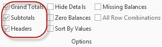 Headers, subtotals and totals can all be enabled or disabled on the Design menu in the Options group.