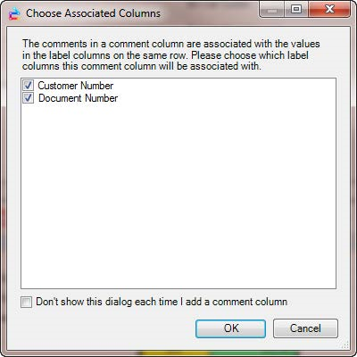 - Select the columns you would like to have associated with your comment column. The purpose of associating comments to columns on the grid is to define when the comment should change. If only associated with the Sold To customer number, then the same comment will display for every line where the Sold To number is the same. If the comment is associated with the Sold To customer number and the Hold Orders Code, then the comment will be the same for each Sold To/Hold Orders Code combination, allowing you to input a different comment for the same Sold To when the Hold Orders Code changes.