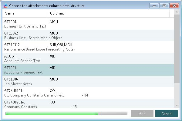 The progress of the scan is displayed at the bottom of the dialog using a progress bar. Based on the columns found by this scan, the dialog is populated with the compatible attachment objects.