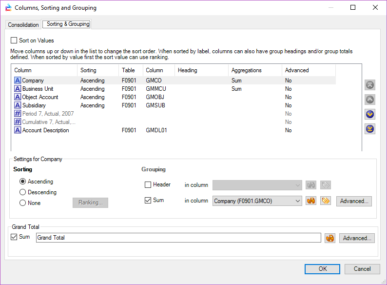 - Select the Sort on Values checkbox if value columns are to be included in the sort sequence. If the checkbox is not ticked, the value columns in the list are grayed out and cannot be included.